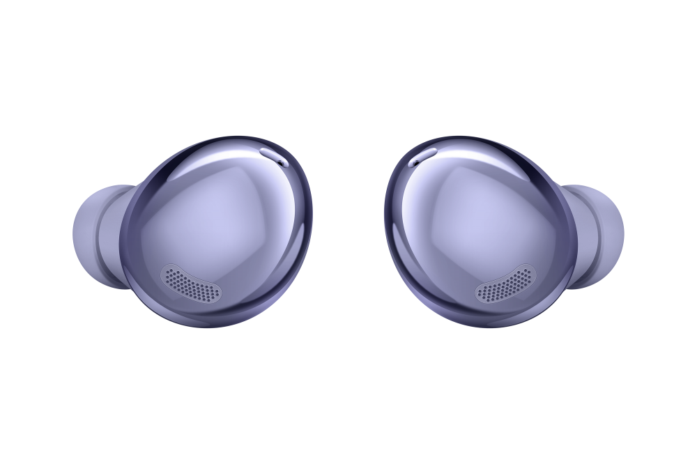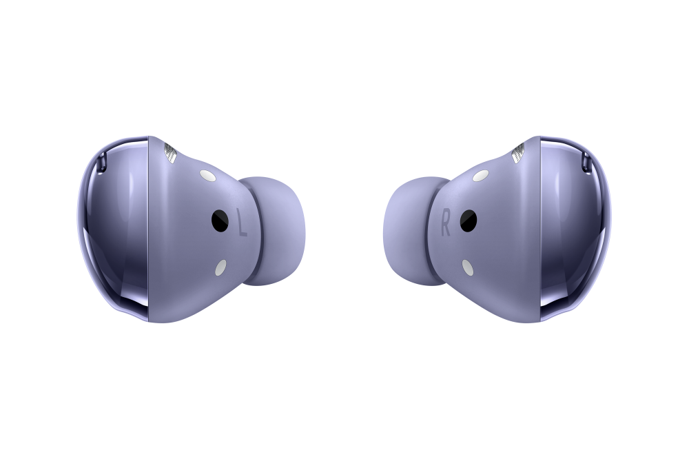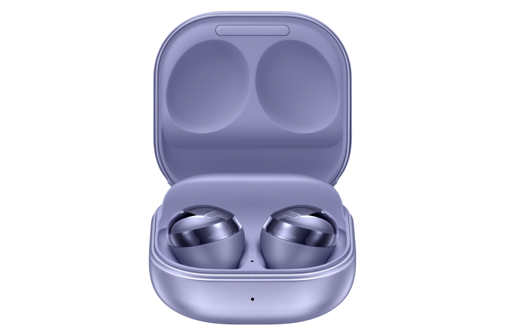Három Galaxy Buds Pro: egy fantomfekete, egy fantomlila és egy fantomezüst színben. Mindegyik a töltőtokba helyezve látható, nyitott fedéllel.